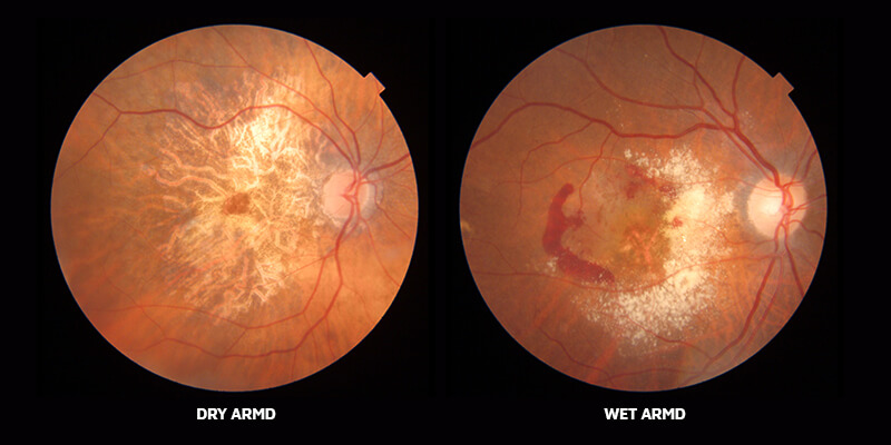 ماکولای خشک (چپ) با فرسایش تدریجی بافتها و تجمع رسوباتی به نام دروزن (زرد رنگ) همراه است، که منجر به کاهش تدریجی دید مرکزی میشود. در مقابل، AMD تر (راست) با رشد رگهای خونی غیرطبیعی و نشت خون و مایعات به زیر شبکیه باعث آسیب سریعتر و شدیدتر به ماکولا میگردد.